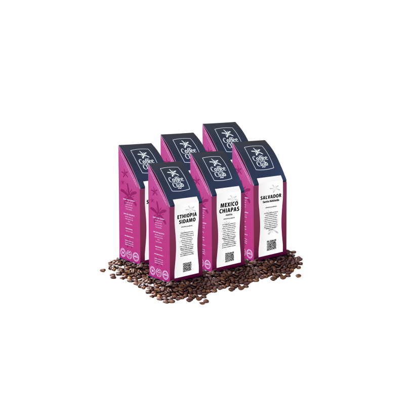 Balení obsahuje kávy Ethiopia Sidamo Washed, Salvador Las Red Bourbon - Santa Adelaida, Mexico Altura Adelita Chiapas, Cuba Serrano Lavado Superior, Brazil Pergamino Sul de Minas a Guatemala SHB Atitlán Ginger, Lot. #1787.